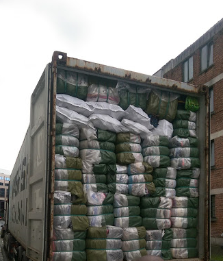 Les vêtements de seconde main ainsi que les accessoires sont soigneusement pressés en ballot ou emballé dans des sacs plastiques pour être expédiés dans des conteneurs de 20 pieds ou 40 pieds.